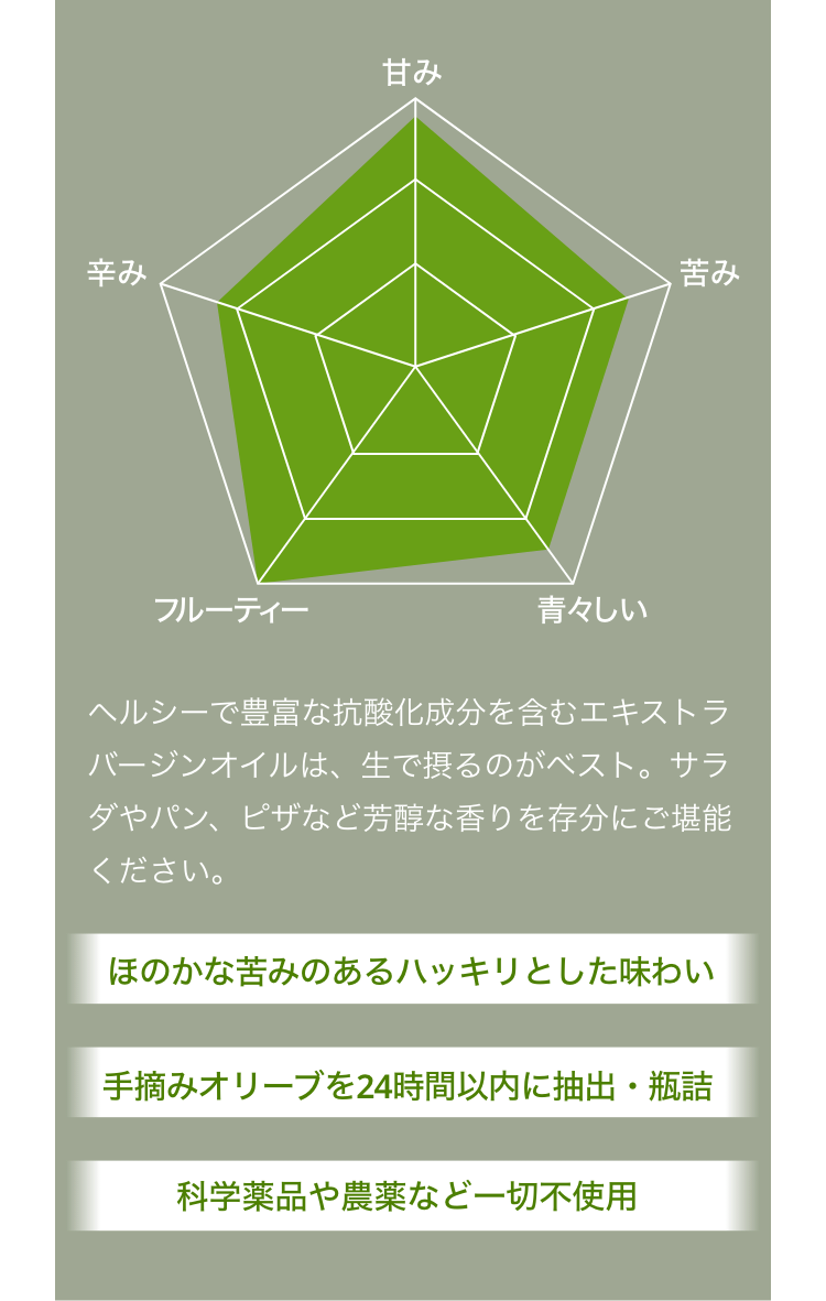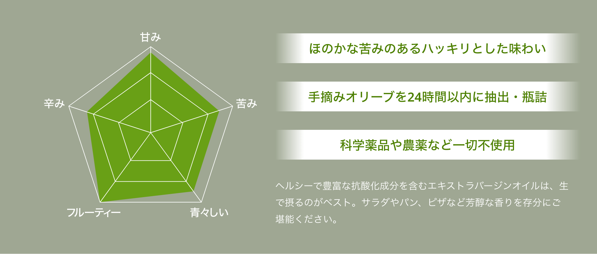 完熟してからていねいに手摘みしたオリーブを、昔ながらのコールドプレス製法で搾油。この方法を用いることで加熱や科学的処理によるオイルの劣化を防ぎ、フレッシュな味わいそのままの100%エクストラバージンオリーブオイルを生産しています。